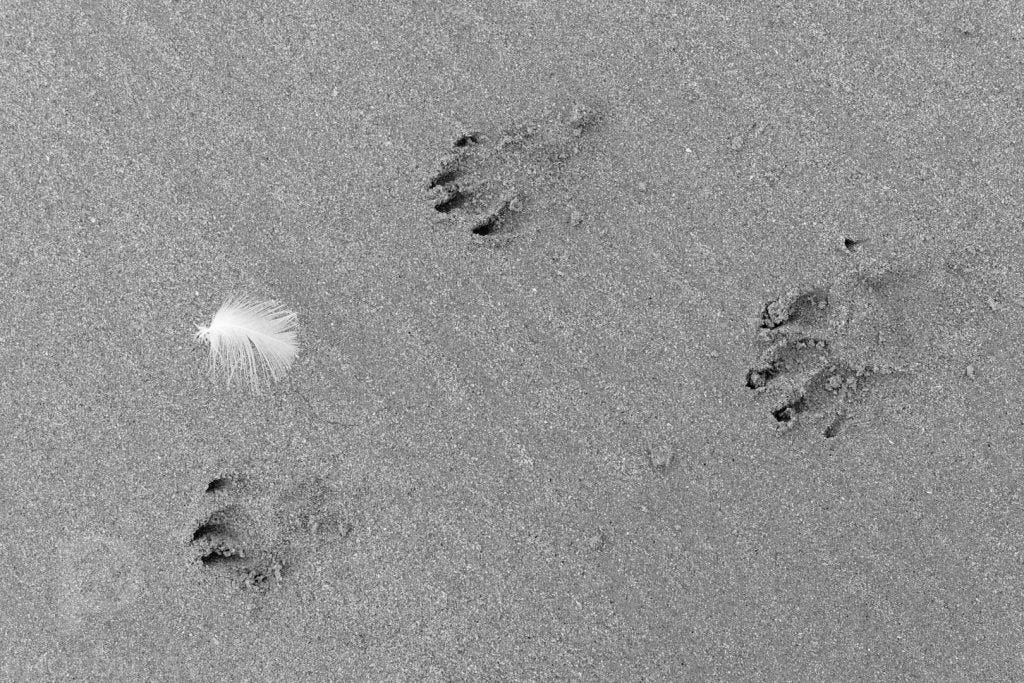 I like the fact that the photo raises questions. It doesn’t tell a story, but saws the seeds of one: why 3 paws and not 4? Whose dog was it? Was it chasing a bird? Are the paw marks and the feather related in any way? Was the dog alone? Do we even know if it was one dog only? What happened next?