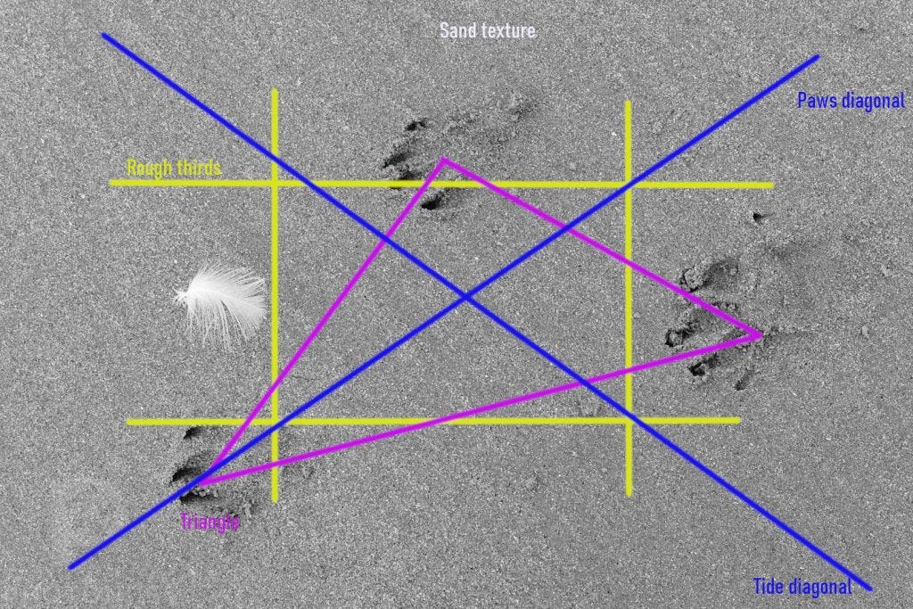 I also framed it so that the paws’ triangle is on a diagonal of the frame. And it just happened to be perpendicular to the diagonal of the tide marks. So you have big X shapes all across the frame.